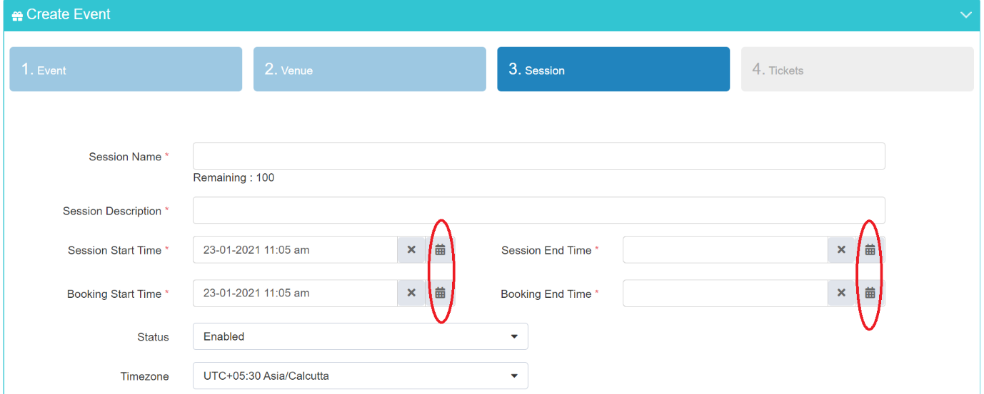 - Then select Session start time, end time and ticket booking start, end time by clicking on the calendar icon beside them.