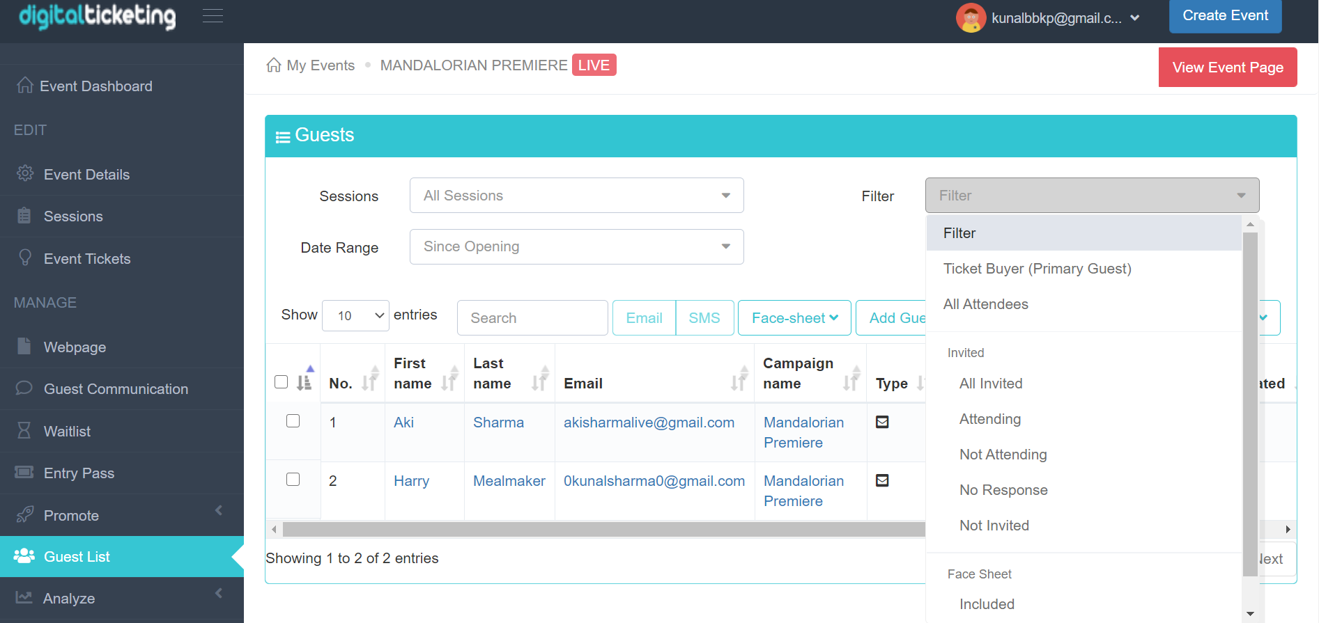 Guest List has the option to filter the guestlist for better analysis of the data. Numerous filter options are provided.